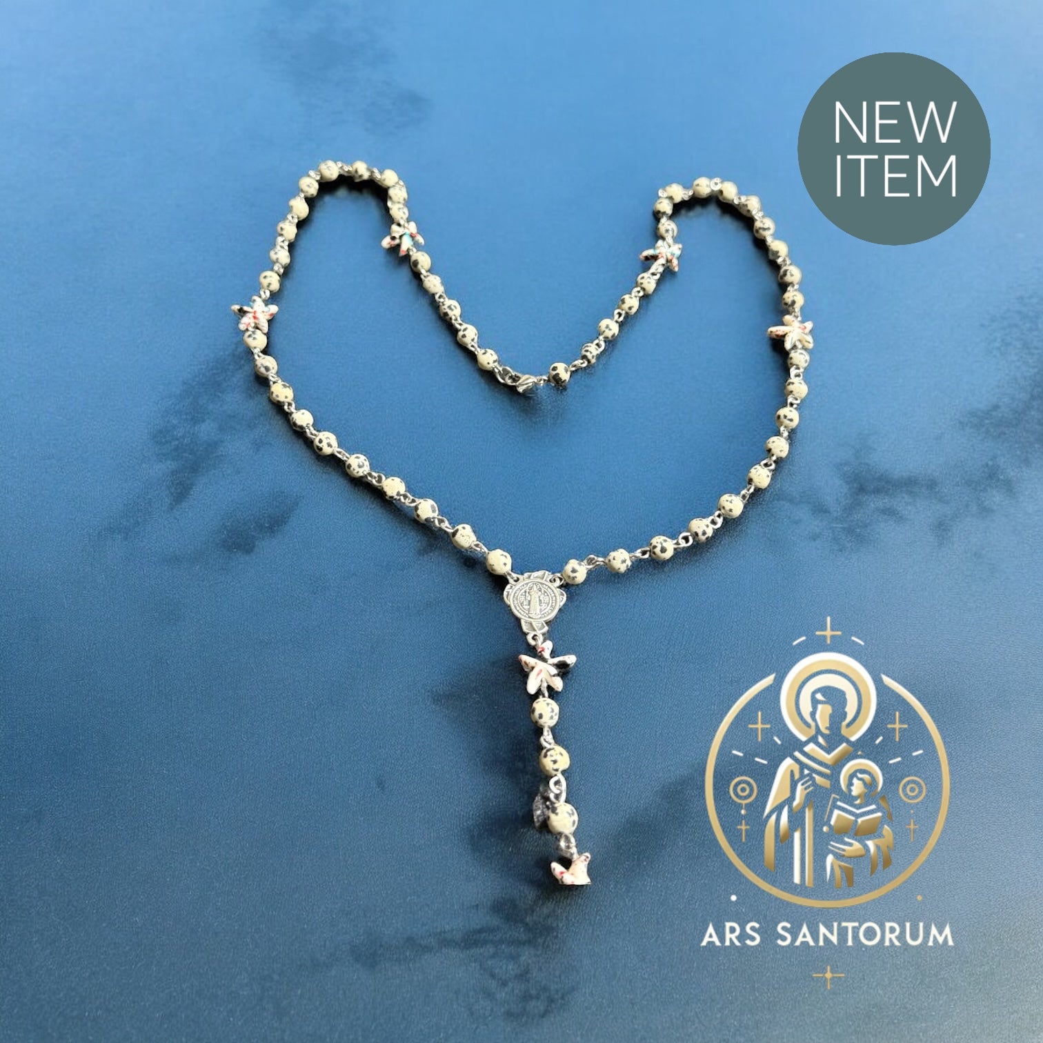 ¡Lleva tu fe al siguiente nivel con nuestro Rosario con estrellas de mar! Cada piedra de jaspe dálmata de 6 mm está cuidadosamente elegida para brindarte una conexión más profunda con tu fe. Con una cruz de San Juan Pablo II y centro de san Benito, ¡este Rosario combina belleza y protección en uno! ¡Siente la conexión divina y luce radiante en el verano con nuestro Rosario!