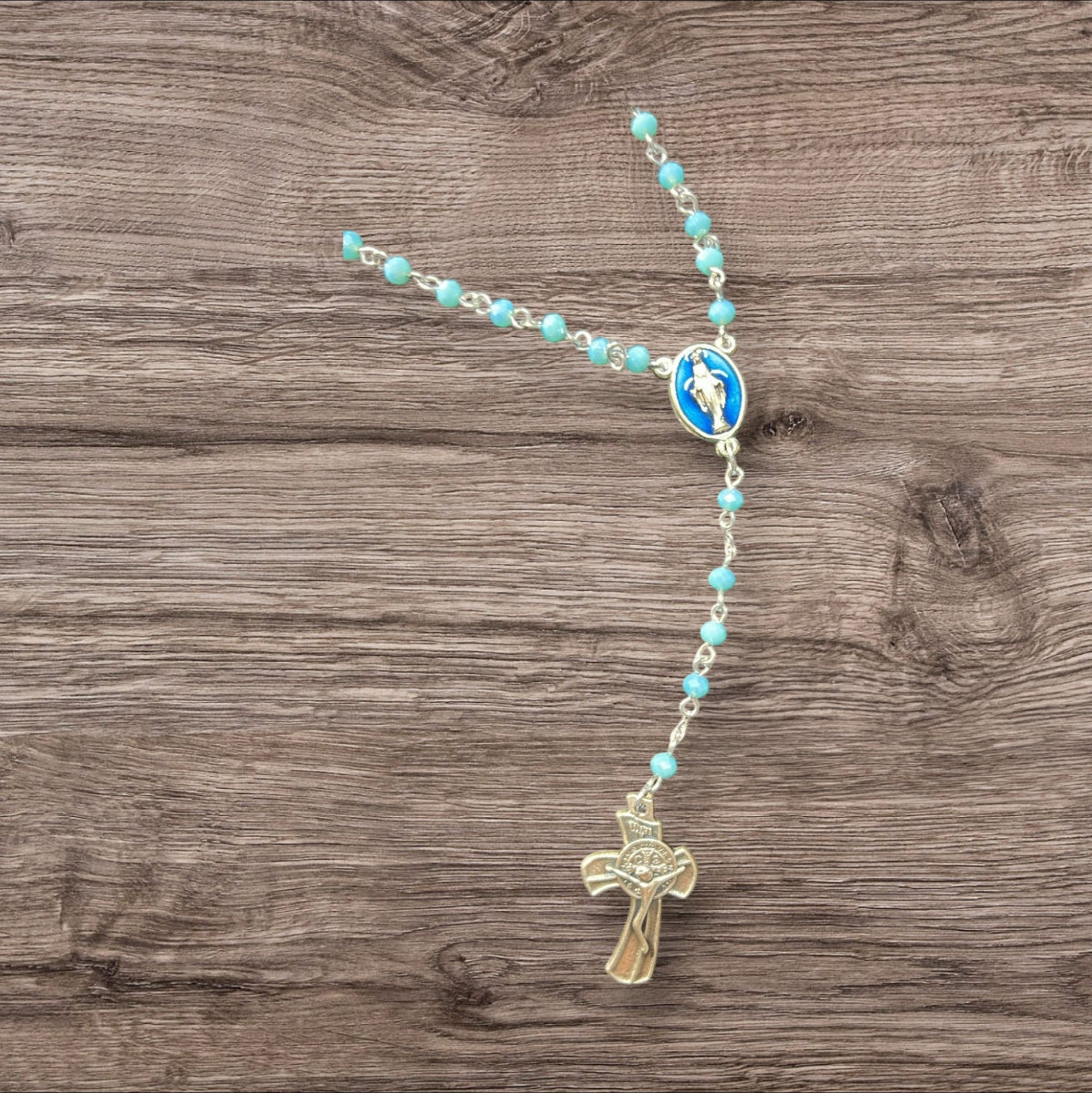 Este Rosario con medalla de la milagrosa y cruz San Benito ofrece una combinación poderosa de protección y belleza. Con una cruz de San Benito, una medalla de la milagrosa y un cristal checo azul resistente a la corrosión, este Rosario ofrece un símbolo poderoso de la fe y la protección contra el mal. Un accesorio imprescindible para cualquier devoto católico.