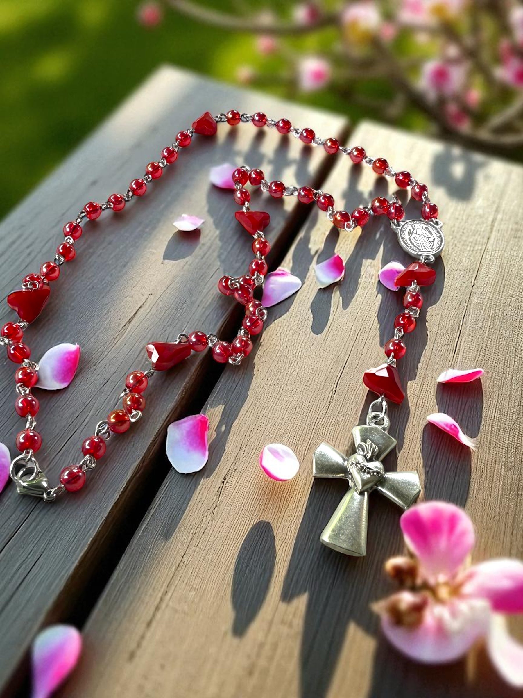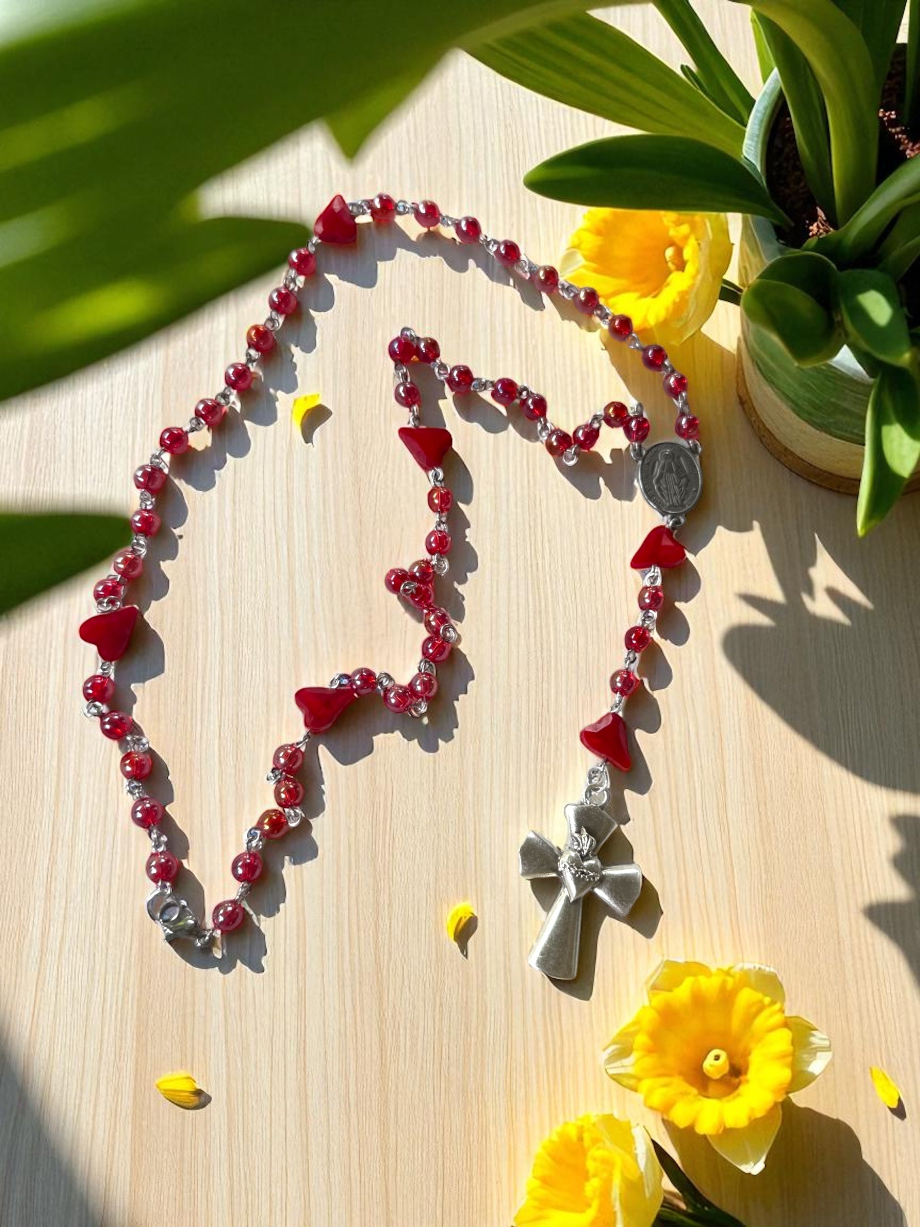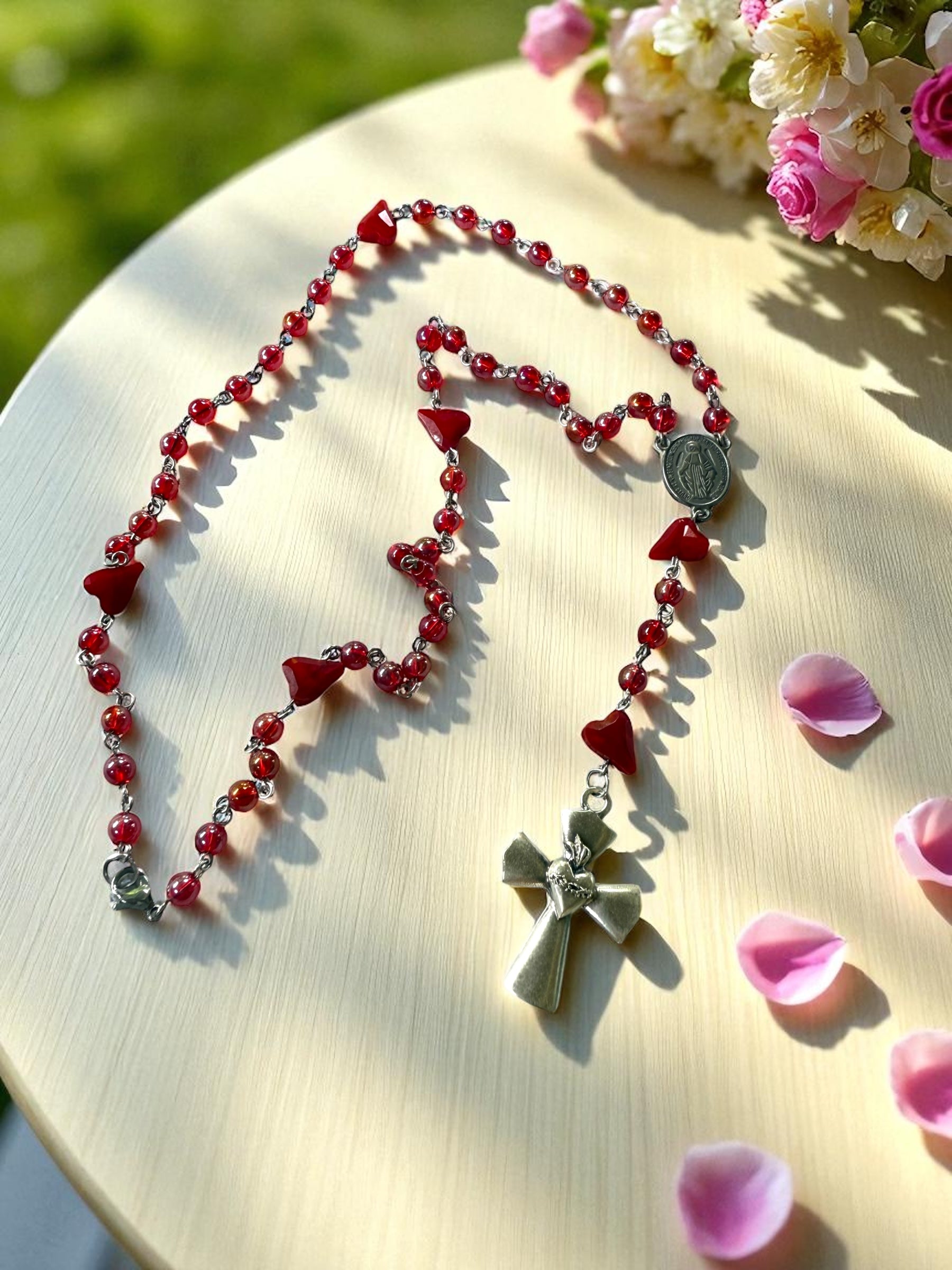 Nuestro Rosario de corazones está hecho con cristal checo de alta calidad, un centro con la virgen milagrosa y una hermosa cruz que incluye el sagrado corazón de Jesús. Lleva siempre contigo esta poderosa herramienta de oración y devoción. Un regalo perfecto para ti o tus seres queridos.