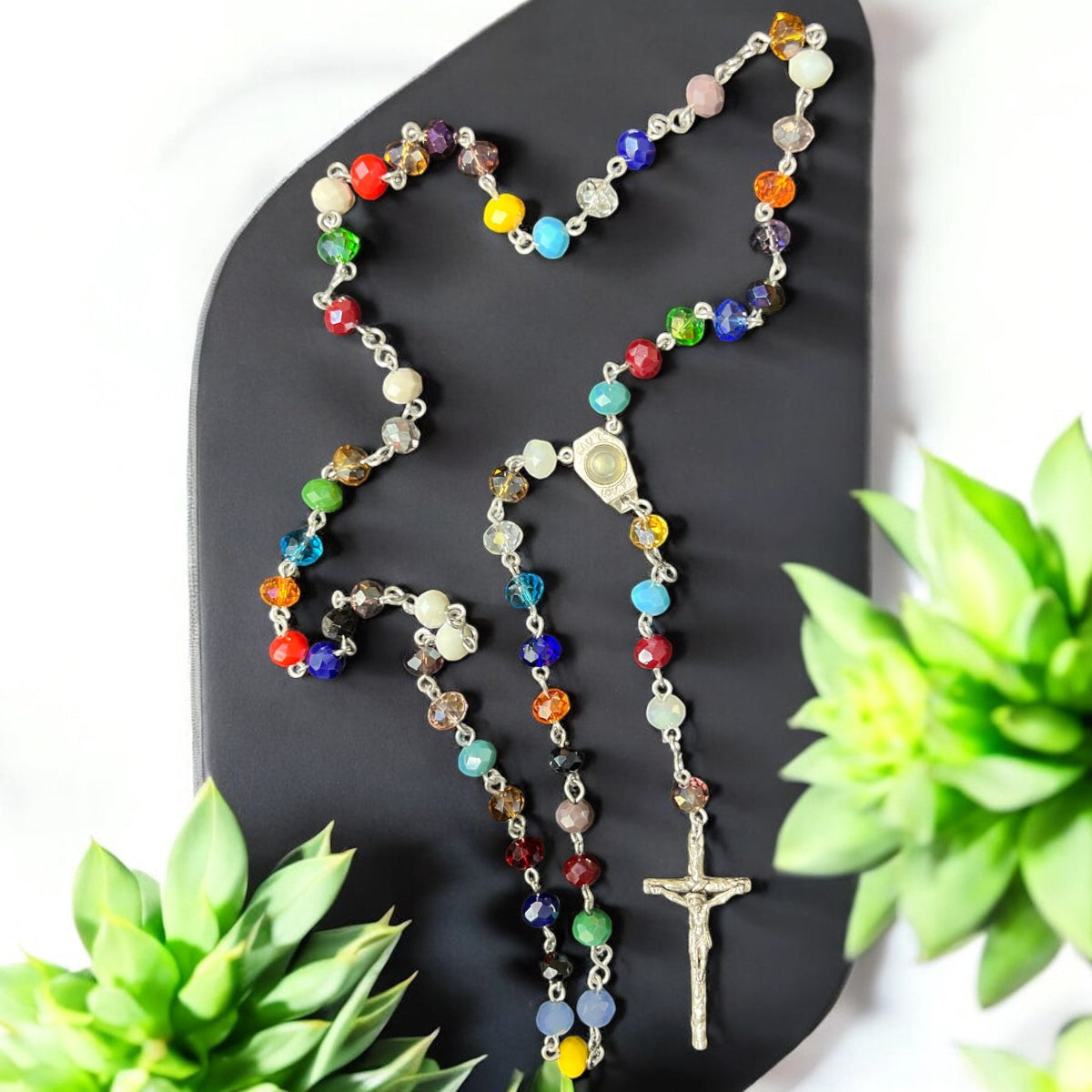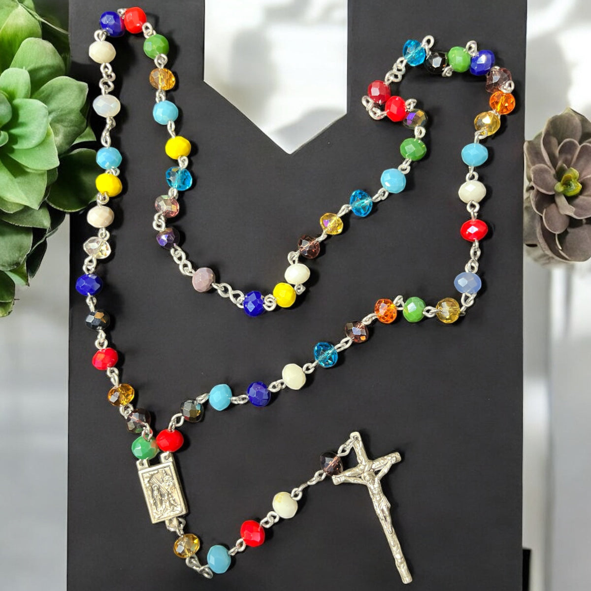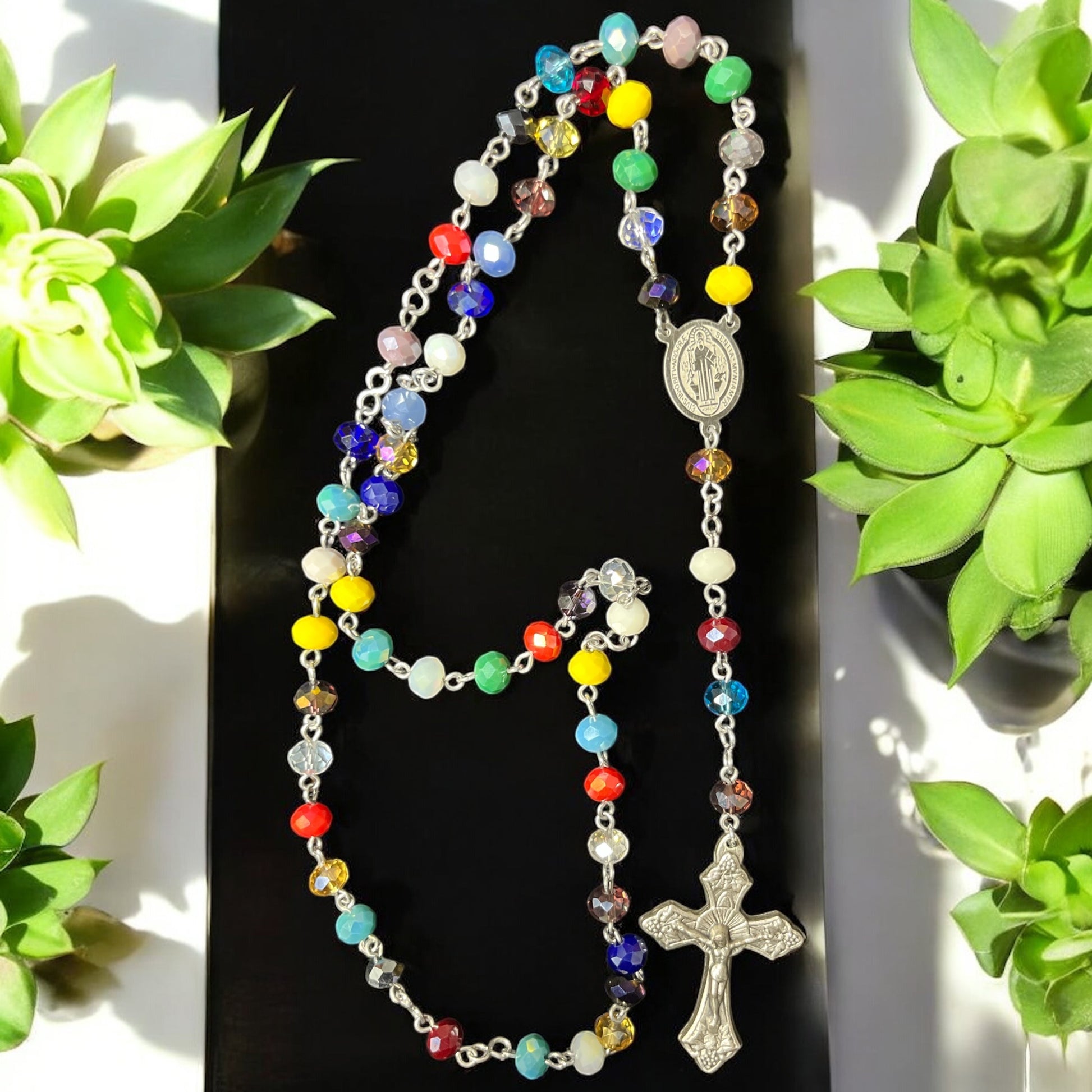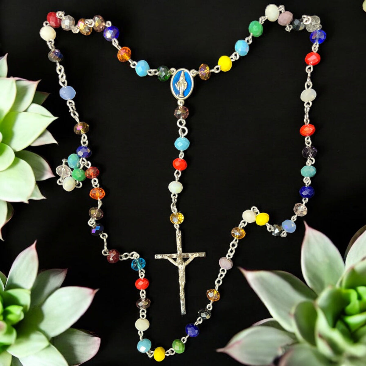 Estos rosarios están elaborados con abalorios de 6x8 mm en colores vibrantes que realzan su belleza y significado. Disponibles con una variedad de centros y cruces, cada pieza combina calidad y diseño para acompañar momentos de oración con estilo y devoción. Perfectos para quienes buscan un accesorio espiritual único y colorido.