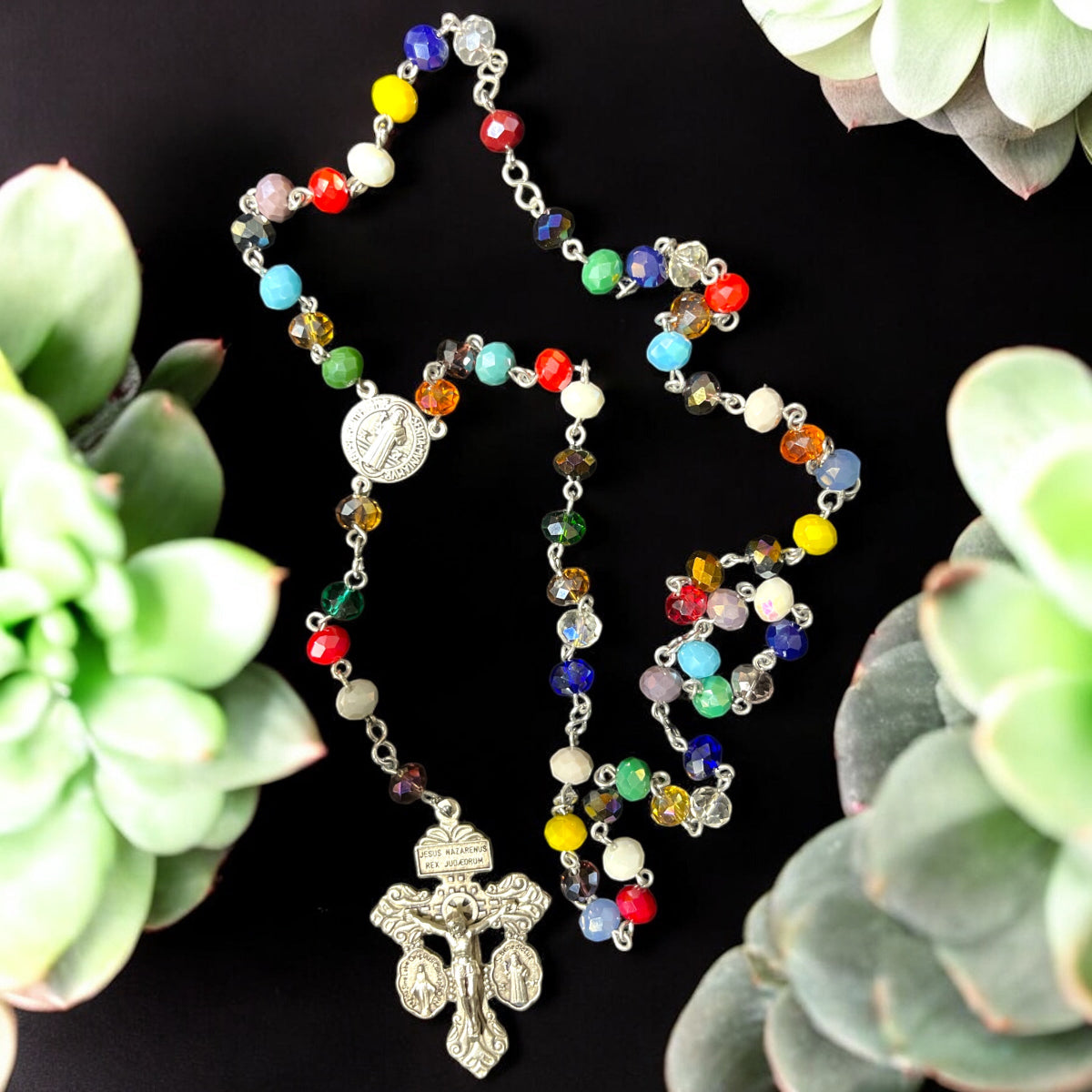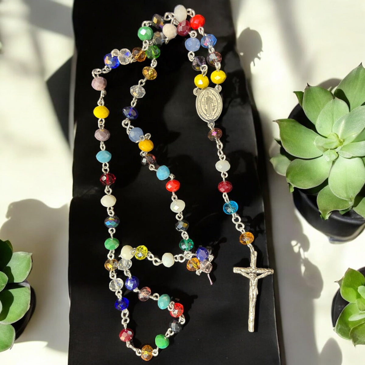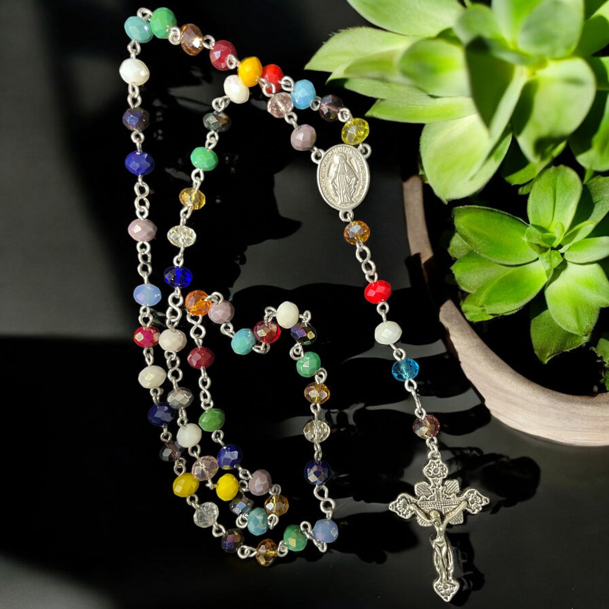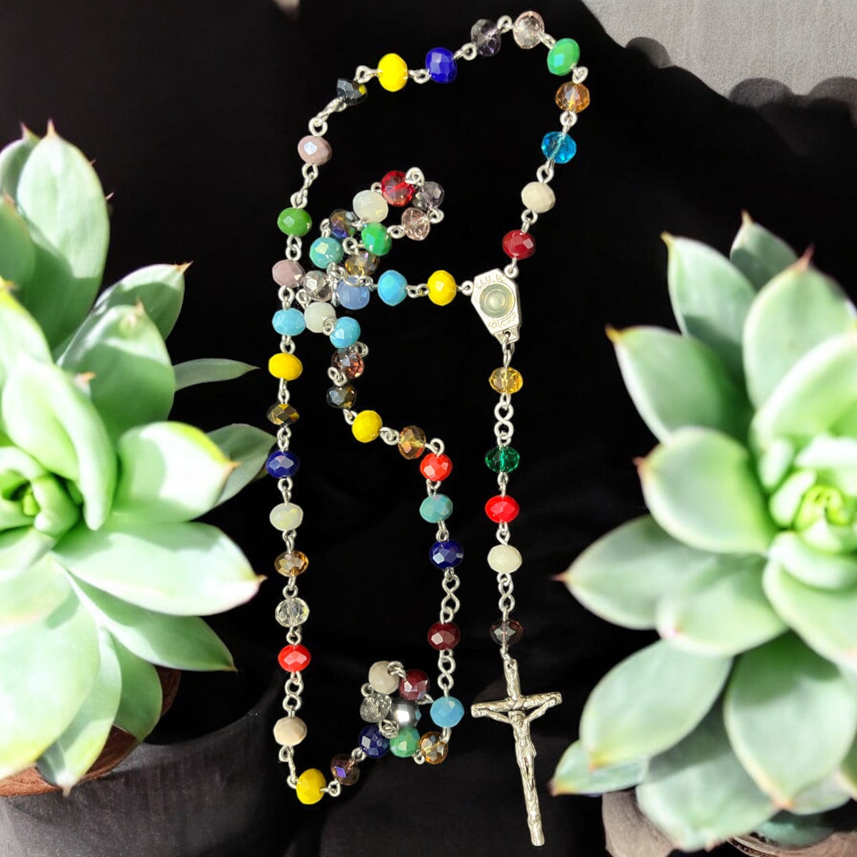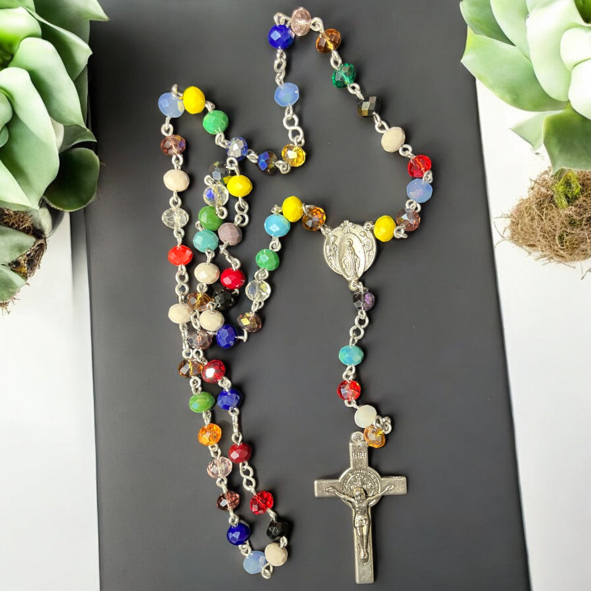 Estos rosarios están elaborados con abalorios de 6x8 mm en colores vibrantes que realzan su belleza y significado. Disponibles con una variedad de centros y cruces, cada pieza combina calidad y diseño para acompañar momentos de oración con estilo y devoción. Perfectos para quienes buscan un accesorio espiritual único y colorido.
