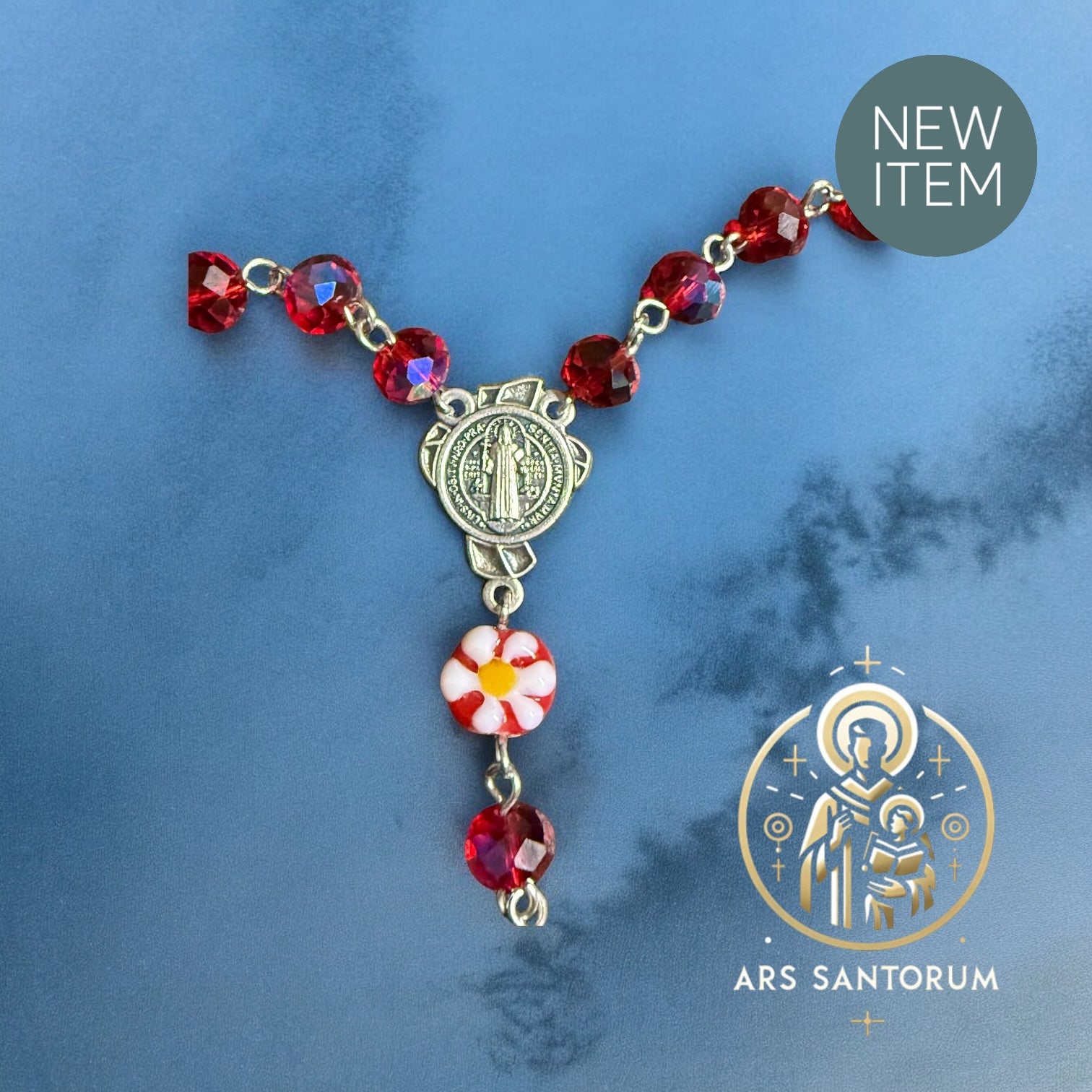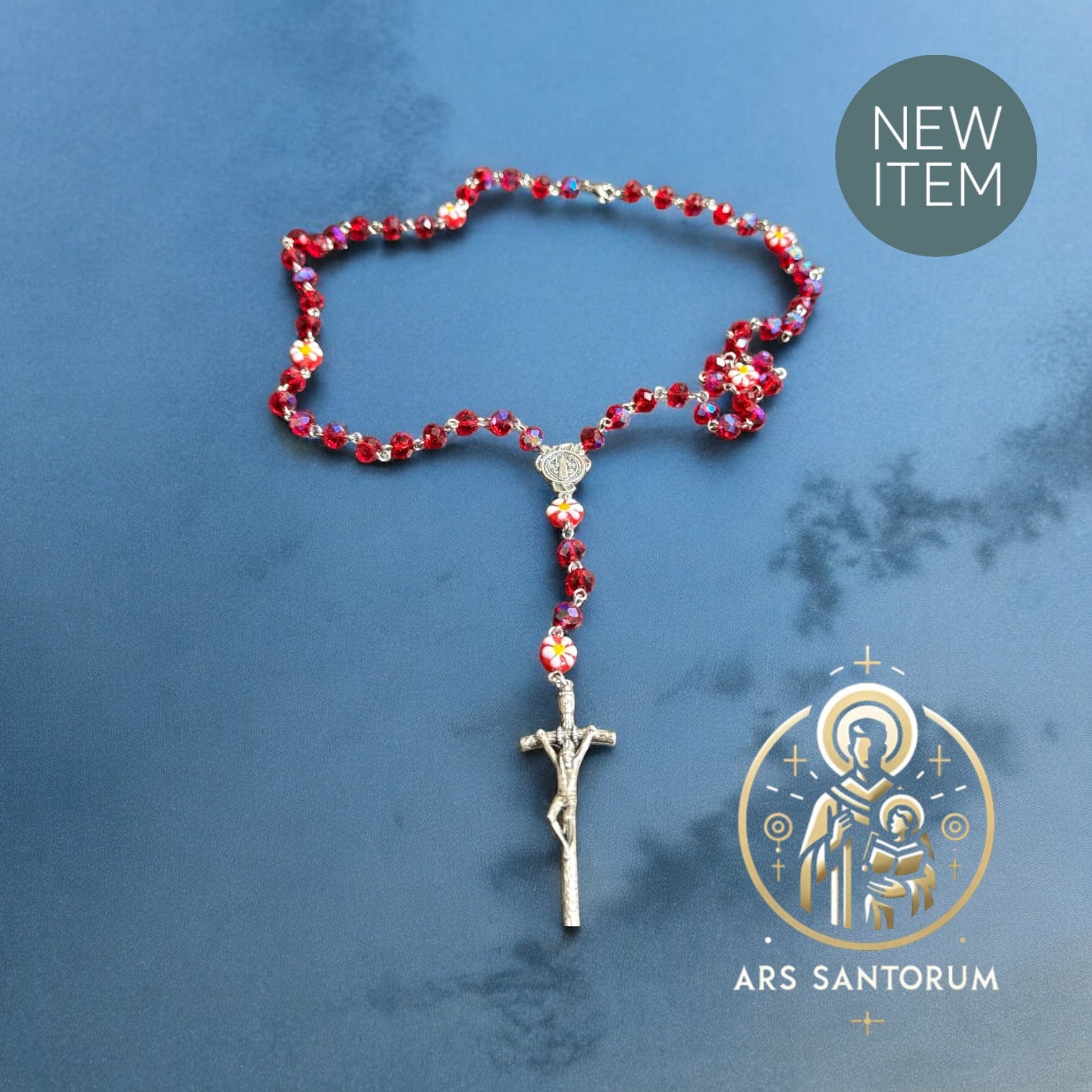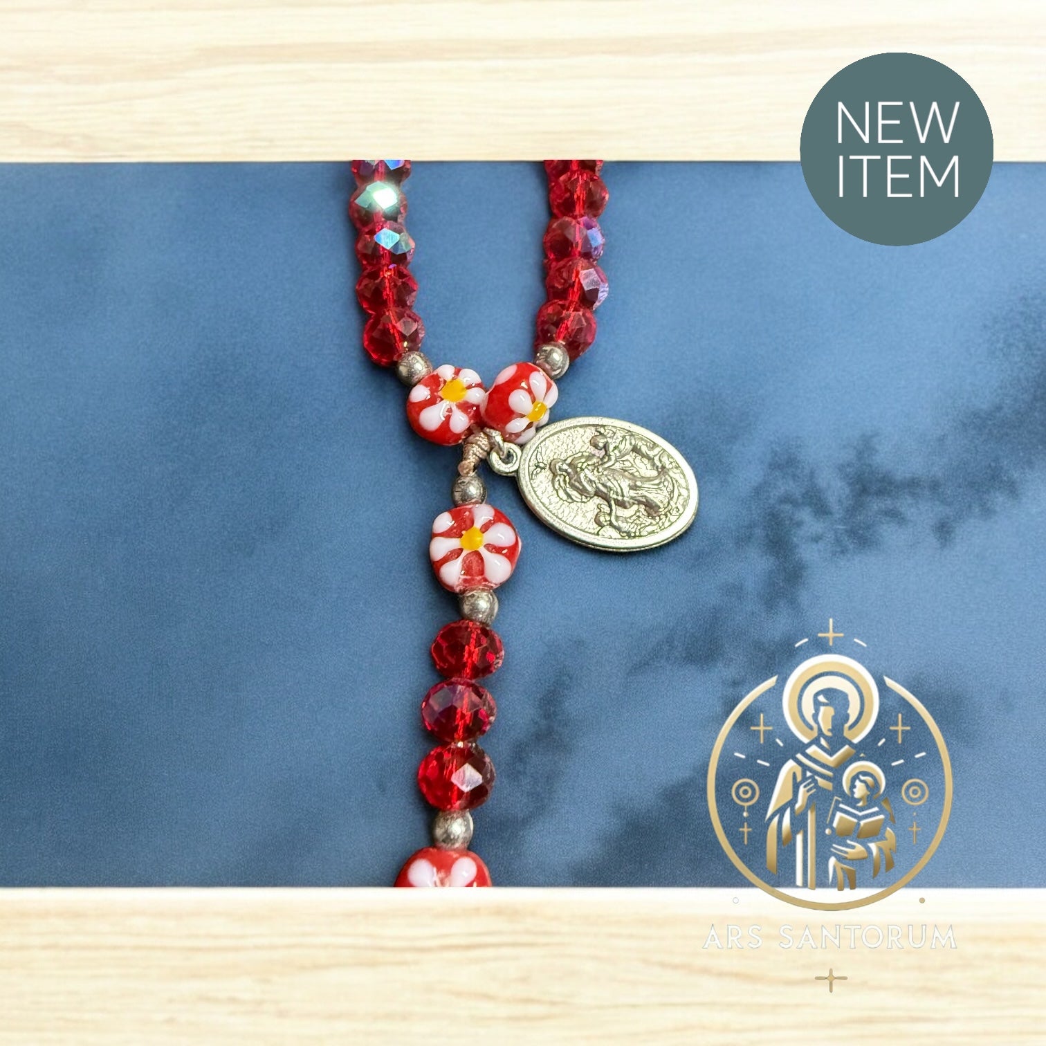 Rosario floral con piedras en cristal checo en un rojo brillante y medalla de la Virgen desata Nudos. Hermoso con un significado espiritual y protección, perfecto para cualquier devoto y para adornar tu día con elegancia y fe.