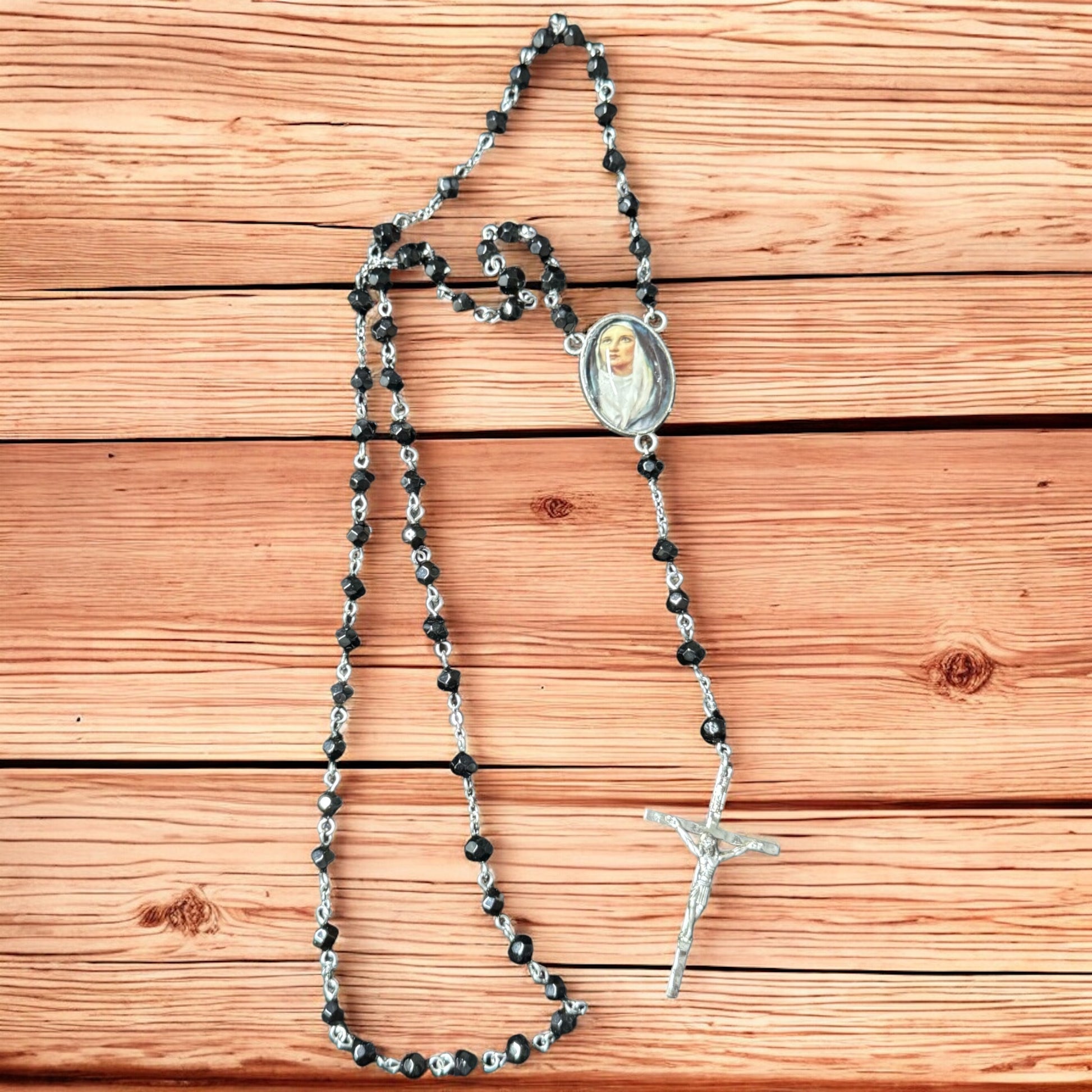 Este rosario en cristales negros de 6mm presenta un diseño clásico y elegante. Sus cuentas de cristal negro de alta calidad proporcionan una experiencia de oración más profunda y significativa. Con la imagen de la Virgen Dolorosa en el centro, este rosario es perfecto para aquellos que buscan una conexión más íntima y espiritual con su fe.