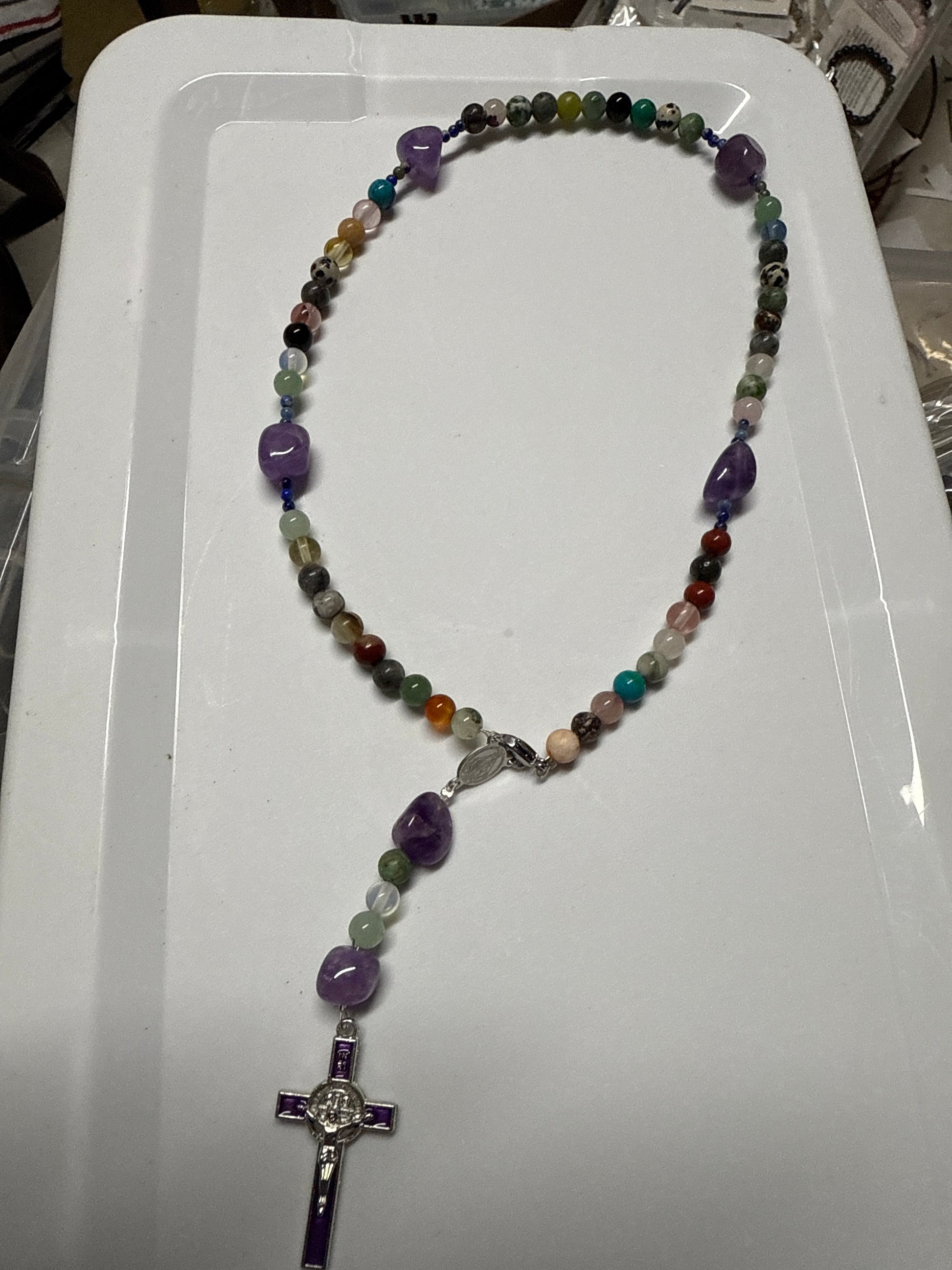 El Rosario de cuarzo multi colores es una hermosa cruz de san Benito que ha sido cuidadosamente elaborada para brindar protección y bendiciones. Con su elegante diseño y variedad de colores, no solo es un accesorio religioso, sino también un símbolo de paz, serenidad y equilibrio. ¡Perfecto para llevar siempre contigo y sentirte protegido en todo momento!